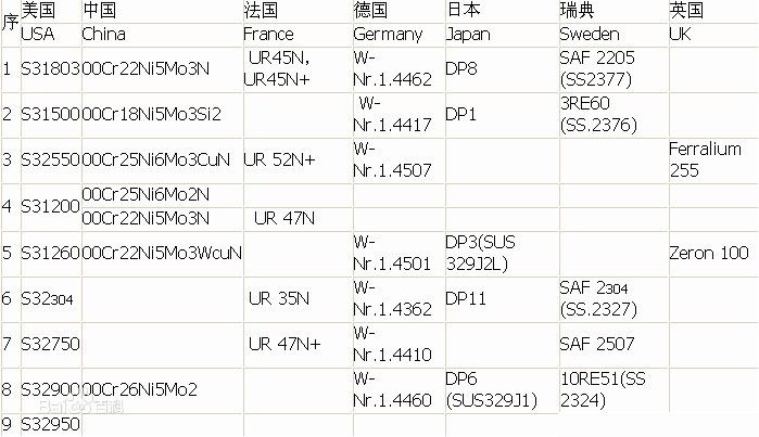 我國新標準GB/T 20878-2007《不銹鋼和耐熱鋼牌號及化學成分》中加入了許多雙相不銹鋼牌號。如:14Cr18Ni11Si4AlTi、 022Cr19Ni5Mo3Si2N、12Cr21Ni5Ti。更多的牌號見標準。