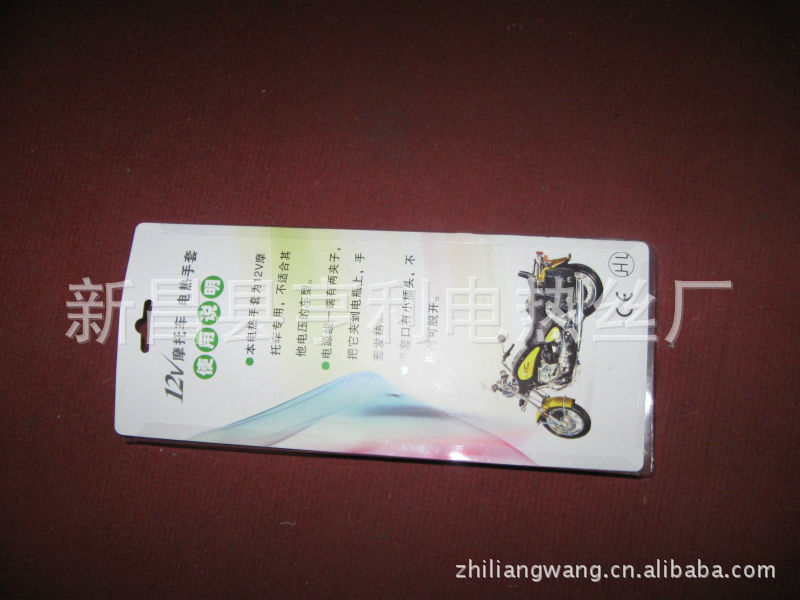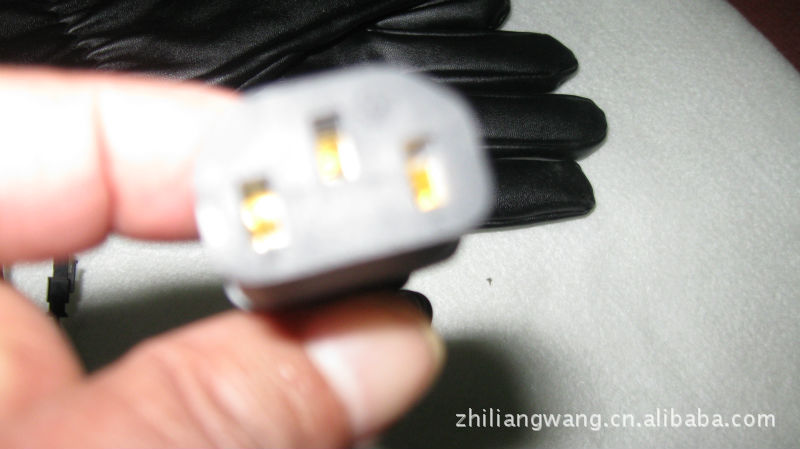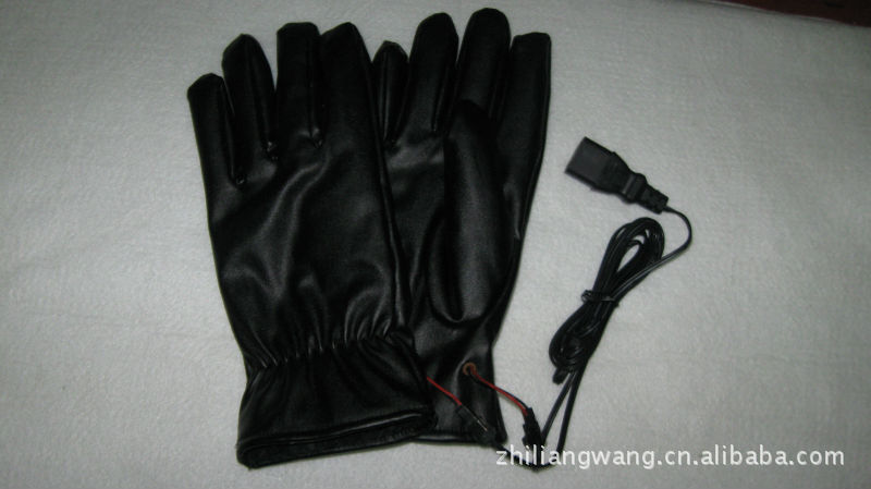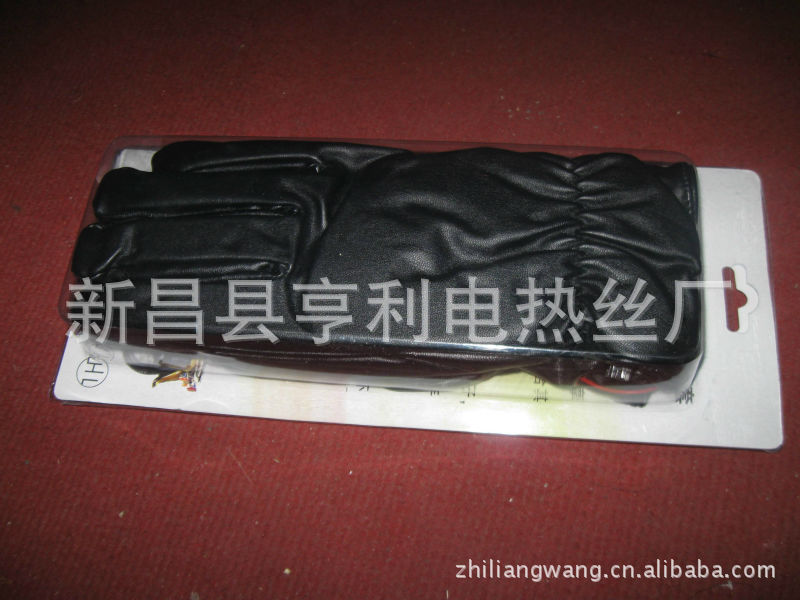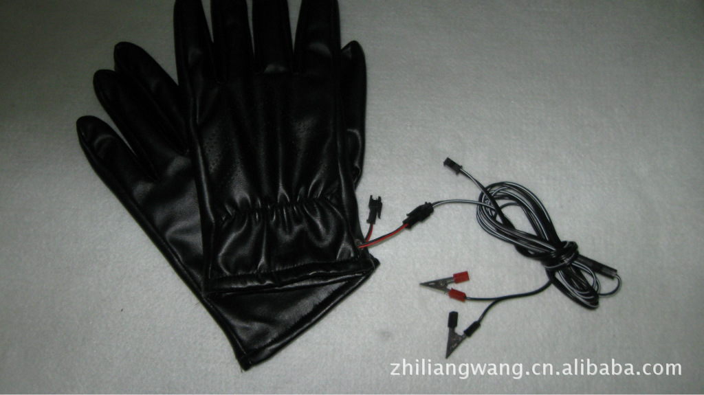手套面料系優質人造革.里子為柔軟的絨布。手套五指和手背部布有耐溫200度的硅膠電熱絲,在零度環境下使用溫度達30度左右,使用前將摩托車電源線上電瓶夾子夾在電瓶上,然后將電源線用膠帶固定在車上,兩分線置于手把,手套口有小插頭,可脫開,使用時只要插上小插頭即發熱,不用要脫開,電動車也一樣將電源線固定后,使用時只要把品字形插頭往充電口插即發熱,