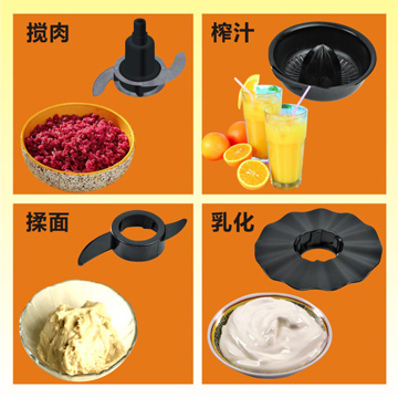 攪肉、揉面、榨汁、乳化工具展示圖;