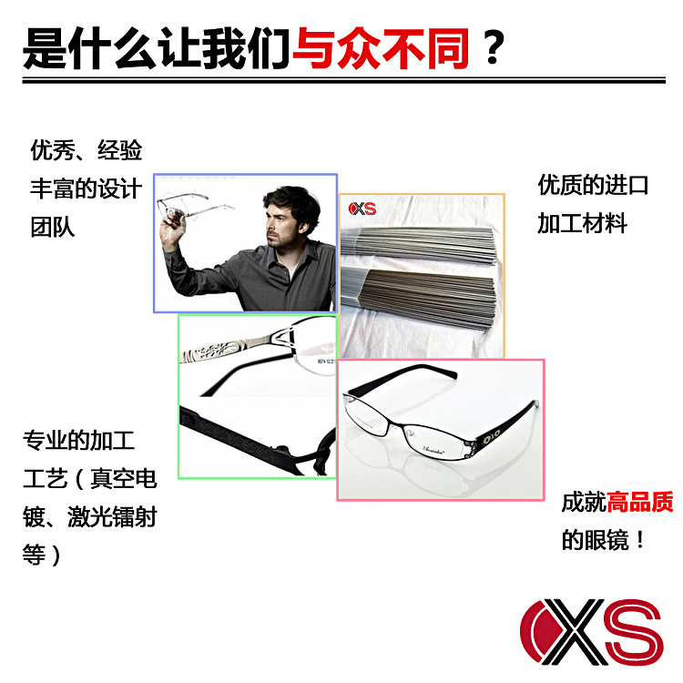 鑫盛眼鏡廠是溫州地區知名精品金屬光學眼鏡廠家,并與多家品牌商合作,進行正規授權的眼鏡代工生產。本廠致力于為各位批發商,零售商提供優質近視眼鏡貨源。