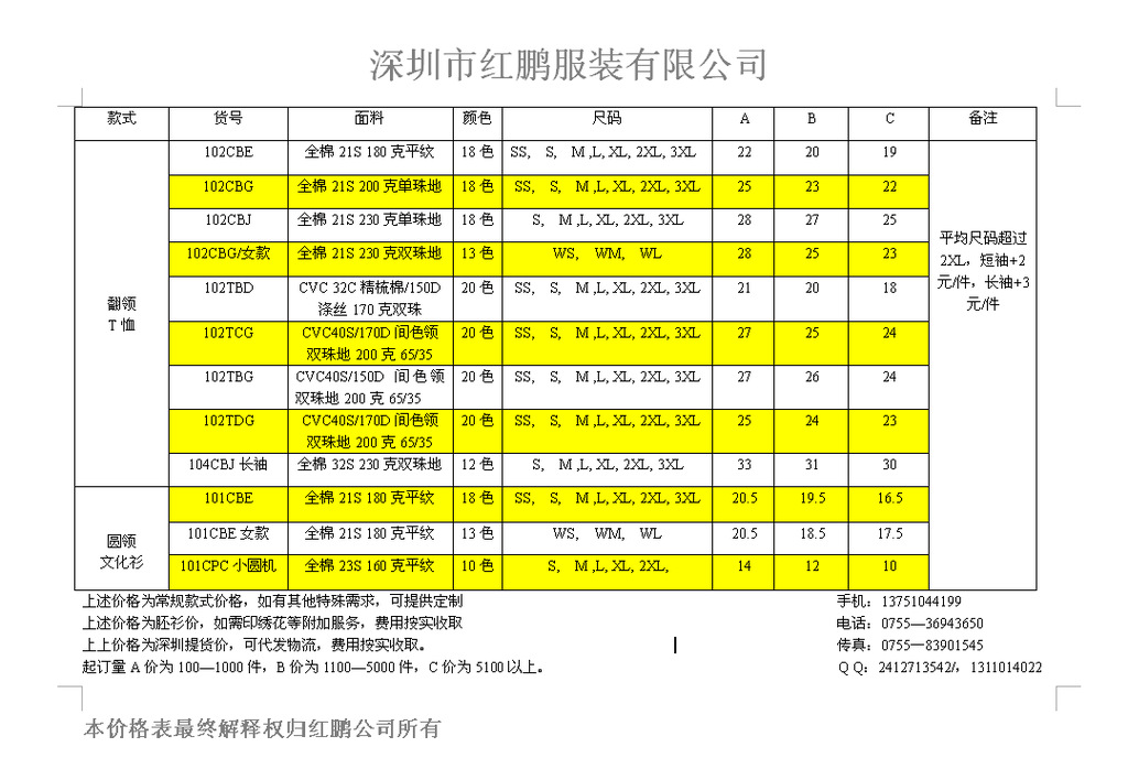 深圳市紅鵬服裝有限公司專業定做批發全棉絲光棉。貨期為15~20個工作日