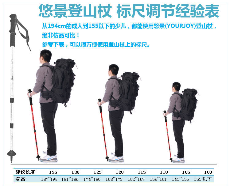 以上為悠景三節杖參考表,因本品為四節杖比三節杖短20cm,更適用175cm以下人士,特此說明。