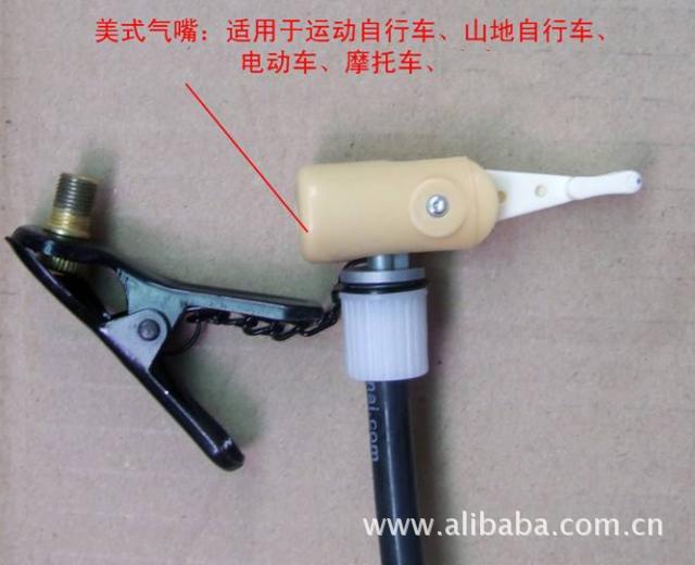 美式氣門:現在生產的運動自行車、山地自行車基本都是美式氣門了,還有電動車、摩托車、汽車也全部都是以美式氣門作為氣門接口的。給這個類型的車子打氣時,先要拔下打氣筒前端的金屬頭(拔下金屬頭時要注意,氣筒氣嘴尾部的黑色塑料手柄應和前面的接口成直線狀態下),完了就可以直接把氣筒出氣嘴連接在車子的美式氣嘴上,按下尾部黑色手柄(壓緊后,手柄應該和前面的塑料氣嘴成90度的直角),就可以直接打氣了。