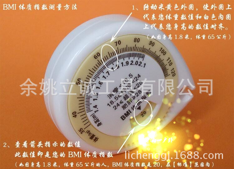 BMI健康尺在于能夠快速的計算出您的身體健康指數,省繁鎖數學計算過程,只需將您的身高和體重數值按羅盤庫指示相對應,箭頭所指就是您的健康指數值。操作簡單方便,老少皆宜適用!