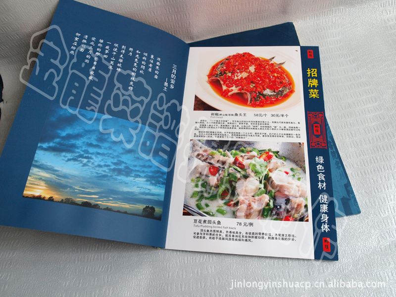 蝴蝶裱裝是目前高檔菜譜的主要裝訂形式之一,特點是每個版面都是完全展開的,方便顧客翻