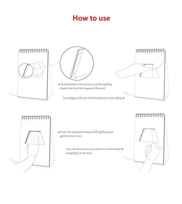 (Page by Page)翻頁燈的創意——我們可以將之理解為是是一顆嵌在臺歷上的LED臺燈,臺歷上的每一頁都有不同的圖片主題或者涂鴉,每翻動一頁,就連生活都好像一起翻開了新的一頁,整個世界都為之不一樣起來~