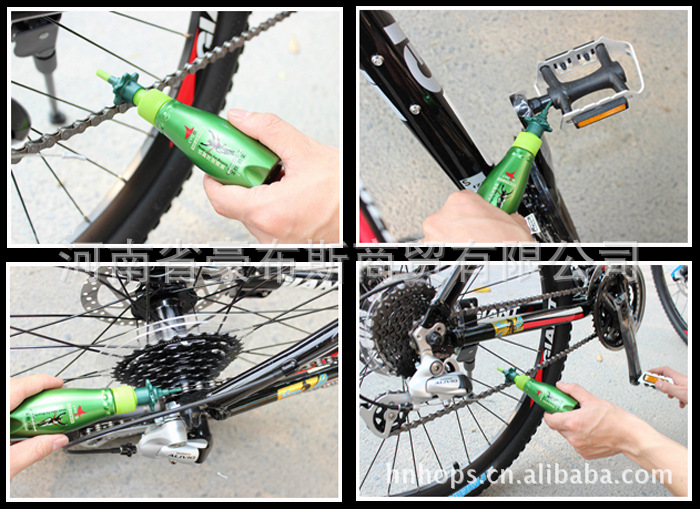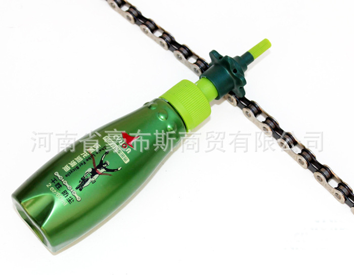 使用方法:充分搖晃瓶子,首次使用需上下多次活動齒輪形油嘴,用力向下壓到底,向上拔到頂 使其能順暢轉動后,即可使用。小齒輪搭在下面那段鏈條上轉動,即可均勻上油。