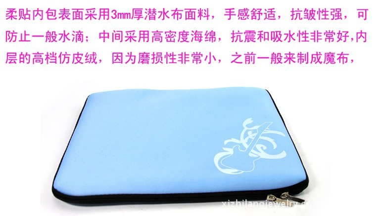 柔貼內包包面采用3mm厚潛水布面料,手感舒適、抗皺性強,可防止一般滴水,中間采用高密度海綿,抗震和吸水性非常好,內層的高檔仿皮絨,因為磨損性非常小之前一般用來制成魔布用來擦光學鏡頭,是采用超細纖維所制,能非常保護您的電腦不受磨損