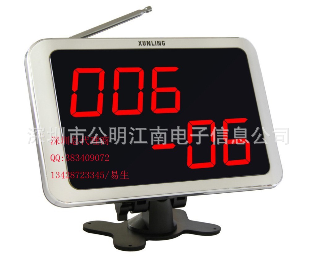 產品型號:迅鈴呼叫器接收機APE1800,三位數顯示,帶語音報號和12種音樂提示音。后面數字表示服務內容代碼:06表示服務,08表示結帳,01表示點餐,02表示酒水。