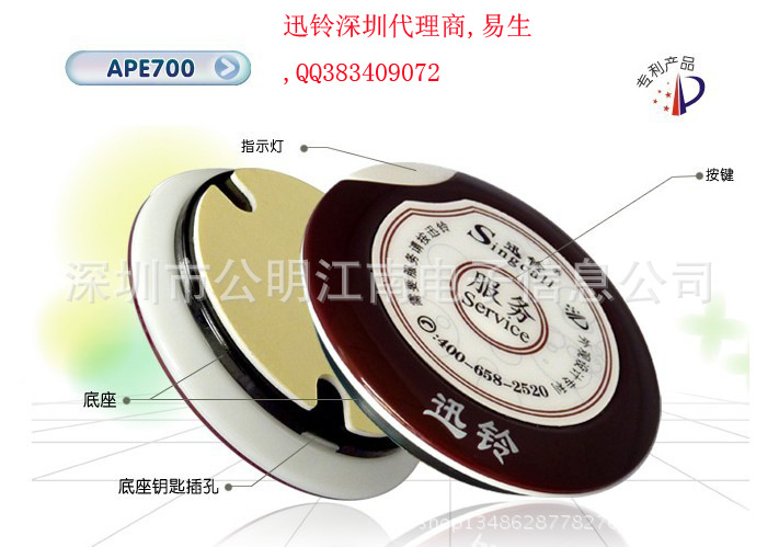 產品型號:迅鈴腕表式接收機APE6600,移動式的,服務員可以戴在手腕上,有震動功能。該接收機可以獨立的工作,不用另加中轉器,距離比普通品牌遠一倍左右。