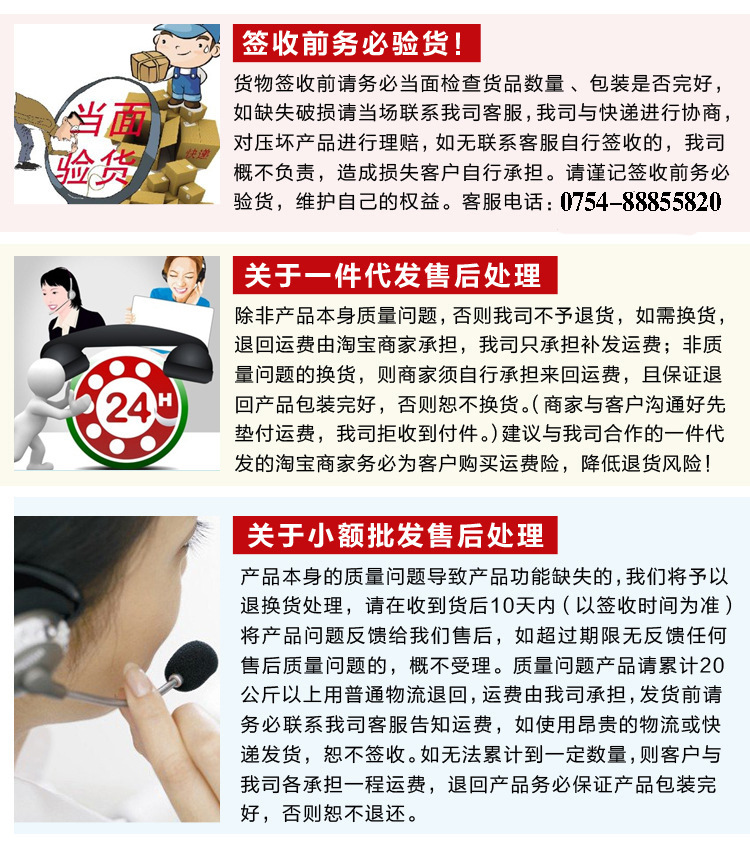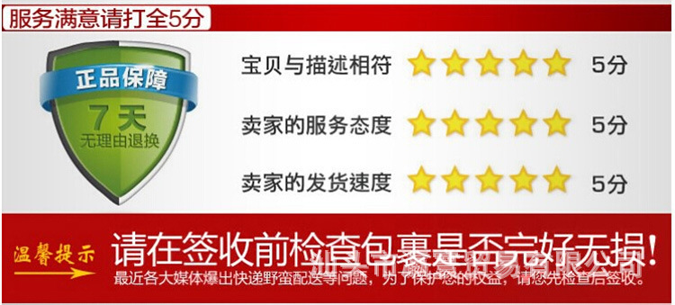 4、我司均有質量檢驗員對產品進行產前、產中、產后等嚴格檢查,確保產品質量100%沒有問題后才會出貨,但因各種不確定因素,我司只可保證到貨后97%-98%的產品質量無問題,2%-3%屬免責范圍。我司發出去的貨物,請客戶先驗貨,后簽收。當發現數量不對或者商品損壞,請立即停止簽收,時間與我們取得聯系。與我司客服人員聯系,協商處理,切勿盲目簽收,所有授權簽收或者代簽均視為收貨人本人或者收貨人本人授權。謝謝親們配合!
