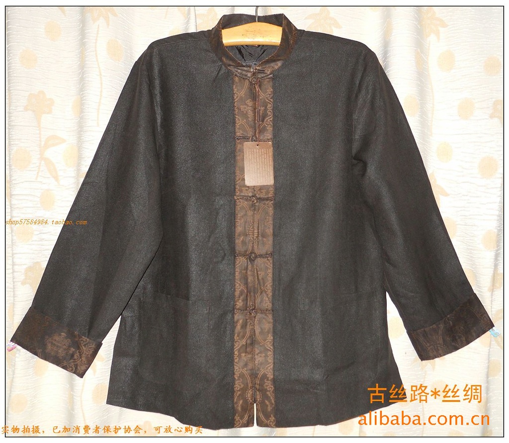 【面布】:真絲香云紗莨綢(100% SILK)---黑色鑲門襟唐裝(外套布料真絲香云紗--每批布料都會有點不同,隨機發貨)
