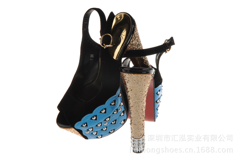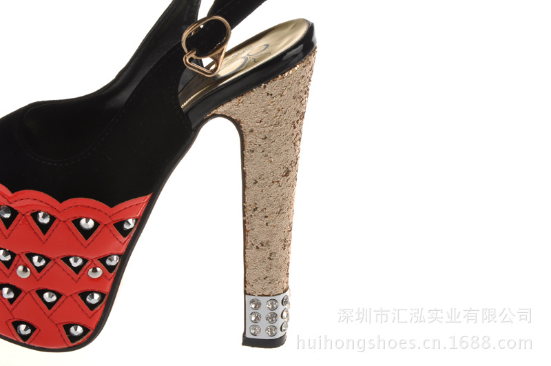 這款鞋子的設計還是很時尚的,賣點是金閃閃的效果、鉚釘、魚嘴設計還有紅色PU大底。紅低高跟鞋是由世界著名的女鞋設計師Christian Louboutin在時尚界帶起的一股潮流。