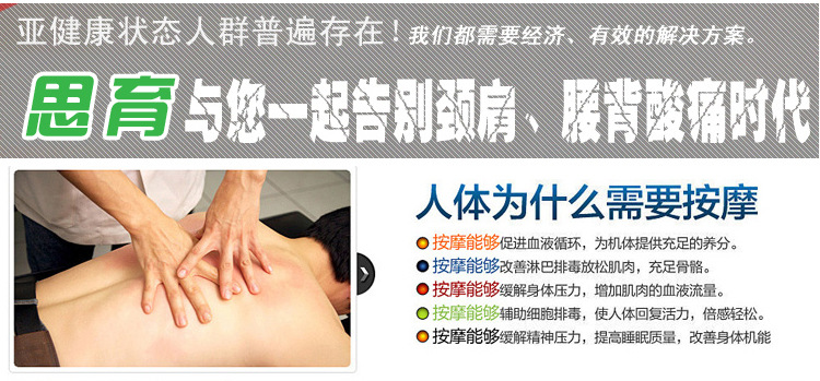 思育創始至今,始終傳承著簡約、時尚、舒適、自然的品牌風格和精湛的設計藝術,引領著按[mo]器具的時尚潮流。思育一直堅持以人為本的設計理念,將按[mo]器械的工業設計與中國古老的推拿理論完美結合,每一款產品都根據人體工程學原理進行開發。設計出能貼近消費者的按[mo]產品,體現了科技帶來的優雅與靈動。我們綜合現代人追求自然、舒適、健康的浪漫情懷,滿足了人們對陽光心情的追逐和健康長壽的訴求,為生活增添了無限動力。公司要求嚴謹,采用高起點、守信用、重質量、積極開拓創新、追求卓越的路線,用真誠來感動每一位客戶,以質量及服務贏得每一位客戶的信賴,業務在不斷地擴大發展。企業優質產品的實現,靠的是精益求精、踏踏實實的工作作風,任何不務實的查驗,不嚴謹的態度都會導致產品質量的下滑,從而失去市場。公司產品行銷于中國本土、法國、西班牙、荷蘭、日本、中東、東南亞等多個國家地區。    思育用熱情的雙手隨時歡迎四海賓客,希望能同國內外新老客戶精誠合作,共謀發展大業。