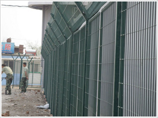 監獄護欄網又稱作“Y型安全防御護網”,是由V型支架立柱,加強型焊接片網,安全防盜連接件和熱鍍鋅刀片刺籠組成強度和安全防御性級別很高。近年來,被廣泛應用在監獄,軍事基地等高安全場所。注:如果在監獄護欄網頂部加裝刀片刺絲、刀片刺繩后又很好的增強了安全防護性能。采用電鍍、熱鍍、噴塑、浸塑等防腐形式,具有很好的抗老化、抗曬、耐候等特點。其產品造型美觀、花色多樣,既起到圍欄作用,又起到美化作用。由于具有安全性高、防攀爬能力好,網片連接方式采用特制SBS緊扣件,有效防止人為的破壞性拆卸,橫向四道折彎加強筋,使網面強度顯著增加。   材質:優質低碳鋼絲。   規格:采用5.0mm高強度低碳鋼絲焊接。   網孔:50mmX100mm,50mmX200mm。    網片中帶有V型加強筋,可大大增強圍網的抗沖擊力。    立柱為60X60的矩形鋼,頂端焊有V型之架?;蛘卟捎?0mmX100mm的掛式連接立柱。產品均為熱鍍鋅后采用高質量的聚酯粉末靜電噴涂,采用國際流行的RAL顏色。 編織方法:編制焊接而成。   連接方式:主要使用M卡,抱卡連接。   表面處理:電鍍、熱鍍、噴塑、浸塑。   優點:1. 具有美觀、實用、方便運輸和安裝的特點。    2. 要以在在安裝時地形適應地形,與立柱連接位隨地面起伏可上下調整;    3. 在監獄護欄網的橫向加裝四道折彎加強筋,在整體成本增加不多的同時,使網面強度和美感顯著增加,是目前國內外之一。   主要用途:監獄、機場封閉 、私人地域、軍事重地、 場區圍網、 開發區隔離網使用.   制作工藝:預直絲、裁剪、預彎、焊接、檢驗、置框、破壞性實驗、美化(PE、PVC、熱浸)、包裝、入庫.