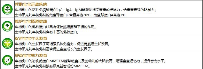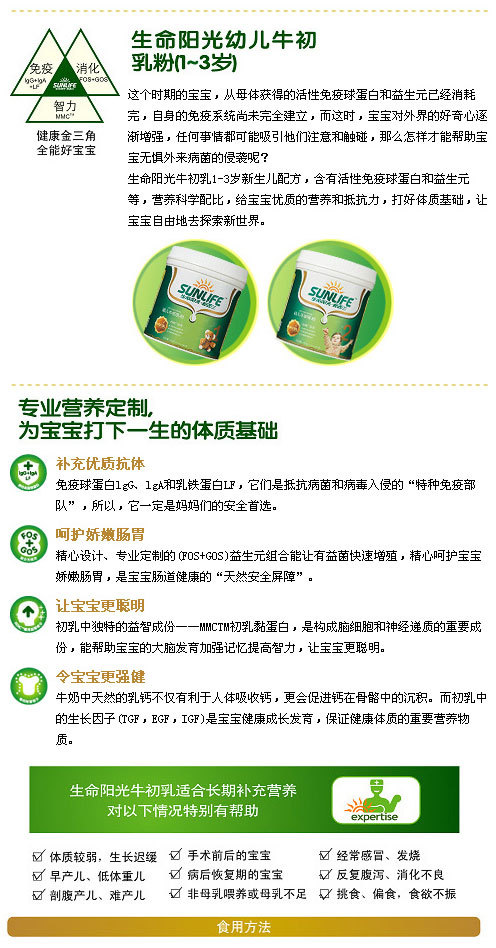 生命陽光嬰幼兒牛初乳配比活性免疫球蛋白加優質天然益生元,針對0~1歲、1~3歲、3歲以上不同階段嬰幼兒健康之需求量身定制,以特殊營養解決寶寶的健康問題!