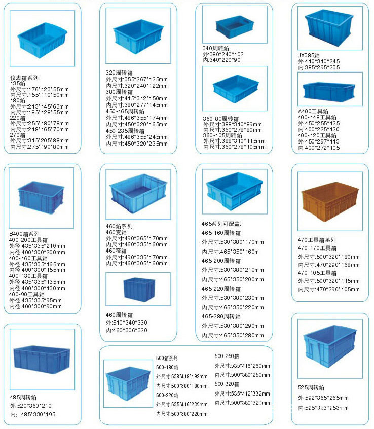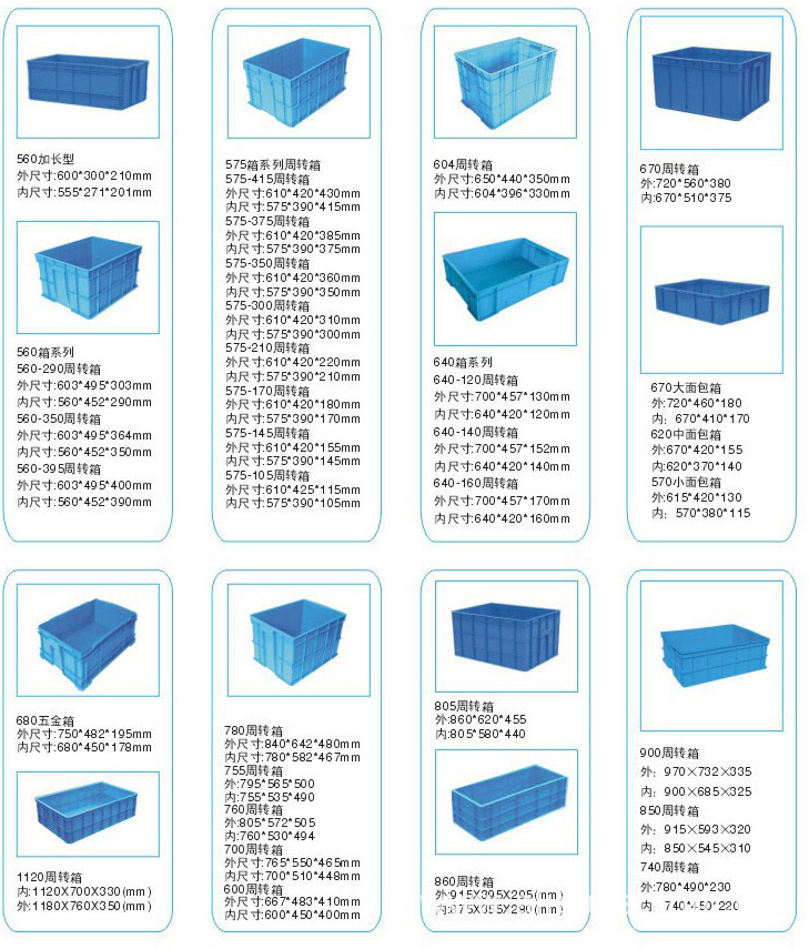 選擇塑料周轉箱注意事項:塑料周轉箱分網眼可疊、網眼可套、封閉可疊、封閉可套四種,適合倉庫、生產流水線、廠區內部周轉及運輸途中周轉使用??莎B型適合堆垛,可套型不適合堆垛,但是可套型在使用完畢后堆垛起來可以節省空間,節約運輸成本。網眼型只可以存放固體物品,封閉型即可存放固體物品也可以存放液體物品。通用塑料周轉箱,由于成型工藝條件關系,上口會略大于底部,因此有效內尺寸略小于實際內尺寸5~7mm斜插式塑料周轉箱,有效內尺寸根據堆放物品不同而異。在生產流水線的輸送帶上推薦使用平底無加強筋的塑料周轉箱,另可配有插卡(標簽卡、標簽袋),也可以配箱蓋,箱蓋通常分平蓋和翻蓋兩種,選用箱蓋后,長*寬*高會相應增加。