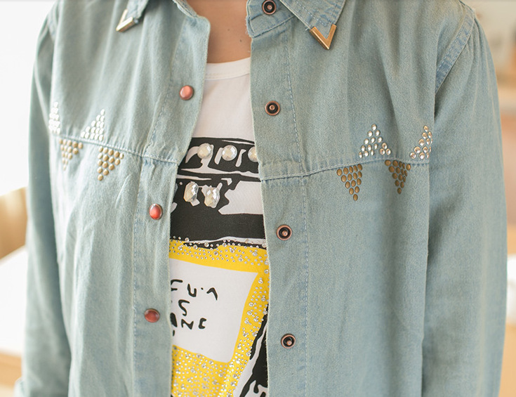本季的牛仔襯衫勢必要將帥氣和中性進行到底,這件襯衫的架勢你們一定會著迷,襯衫的質地是適合春秋貼身穿著的全棉牛仔,經過柔軟水洗整燙處理的牛仔布非常服帖,完全不用擔心內搭外穿的版型問題,這件潮版襯衫上還有另一大亮點,鉚釘裝飾加以巧妙的布局設置,在胸前簡約但強勢的凸顯出來,更在領口安裝了鉚釘領角,加入裝飾后的襯衫完全突顯了它帥氣和中性的風格,任誰都無法取代它獨特的潮流特色。