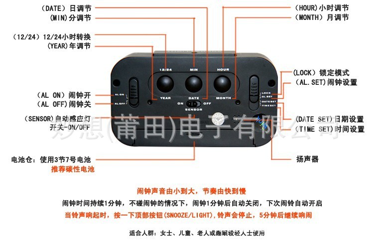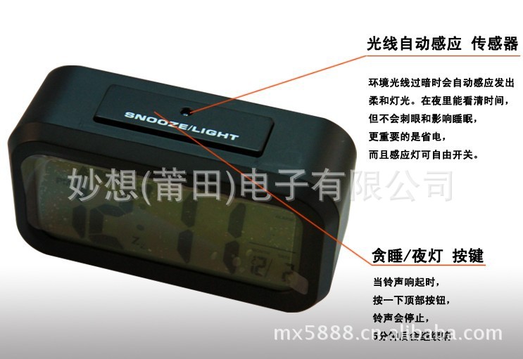 這款鬧鐘功能齊全,鈴聲是BB的漸進鈴聲,響鈴時間持續一分鐘,鬧鐘響起可按下貪睡鍵暫停5分鐘。