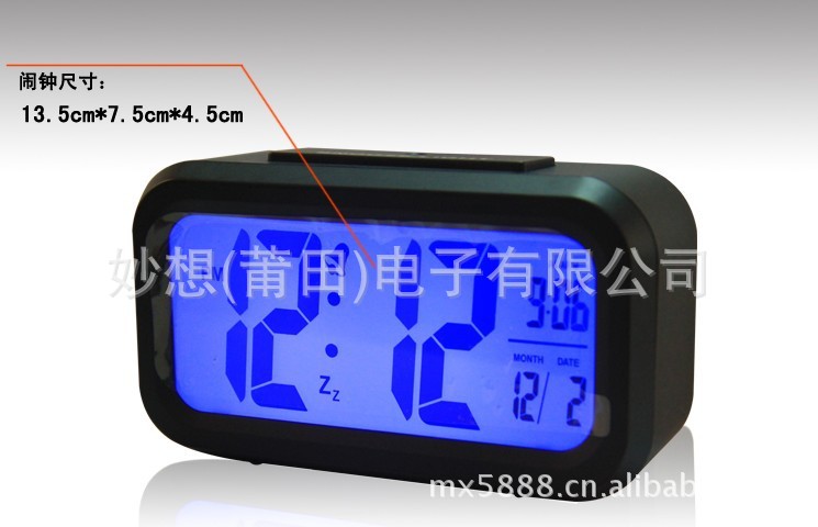 鬧鐘帶光敏傳感器,夜晚無燈光狀態,LED藍色夜燈會微微亮起。