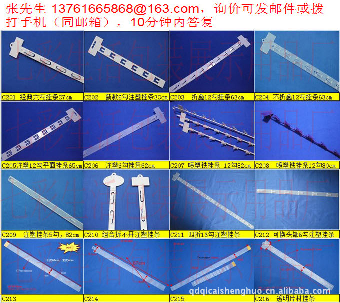 本公司是北方地區的掛鉤掛條生產基地,現有注塑掛條十幾款,展示掛鉤上百款,包裝用掛鉤也衣架近千款。