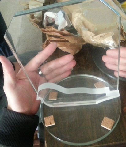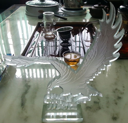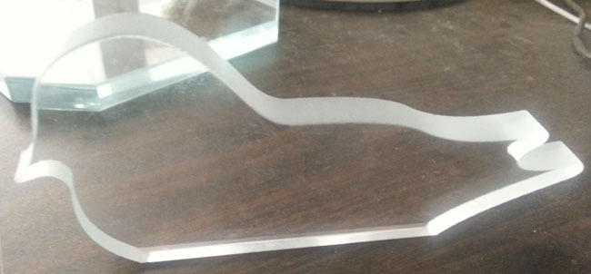 此款玻璃有三個工藝,水刀切割鳥型,再上藥水砂,和背板底板粘連。出口成品。