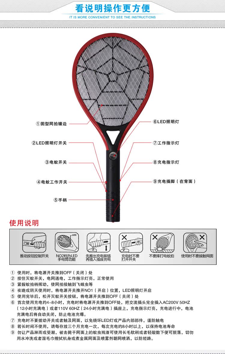 新出廠的電蚊拍電池有少量電量或者沒有電量,次使用,請充滿電再使用(充滿電需要8-10小時),謝謝!