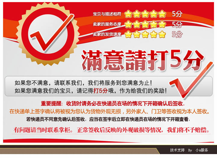 簽收時請務必當著運輸工作人員的面,打開包裹檢查商品有沒有損壞,核對數量是否正確,如果發現有問題一律拒簽,或是有問題一定當快遞員面聯系我們,待簽字之后,工作人員離開,發生的問題,買家承擔,為了有一個愉快的交易,請一定執行!謝謝!一旦簽收則視為對商品已認可。