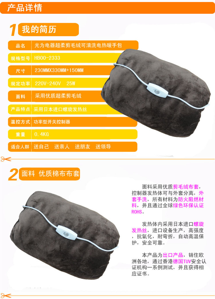光為電器 超柔剪毛絨開關型 插電式暖手包 電熱暖手 電暖寶