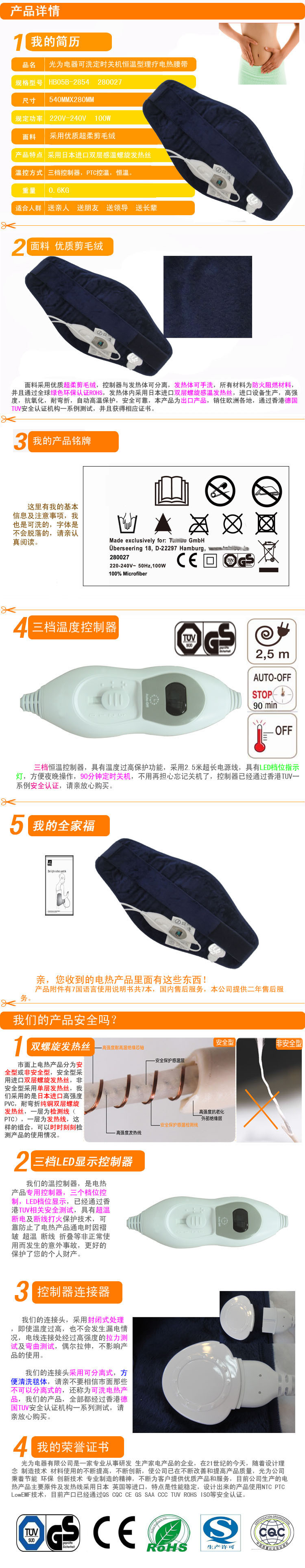 公司生產的主要產品有電熱毯,熱敷墊等。目前公司生產的電熱產品主要原件及發熱線采用日本及英國進口。特點是性能穩定,設計出來的產品使用NTC,PTC,LOWEMF技術,使產品在安全特性方面走在行業前端。目前產品已通過CE,GS,SAA,TUV 等安全認證。