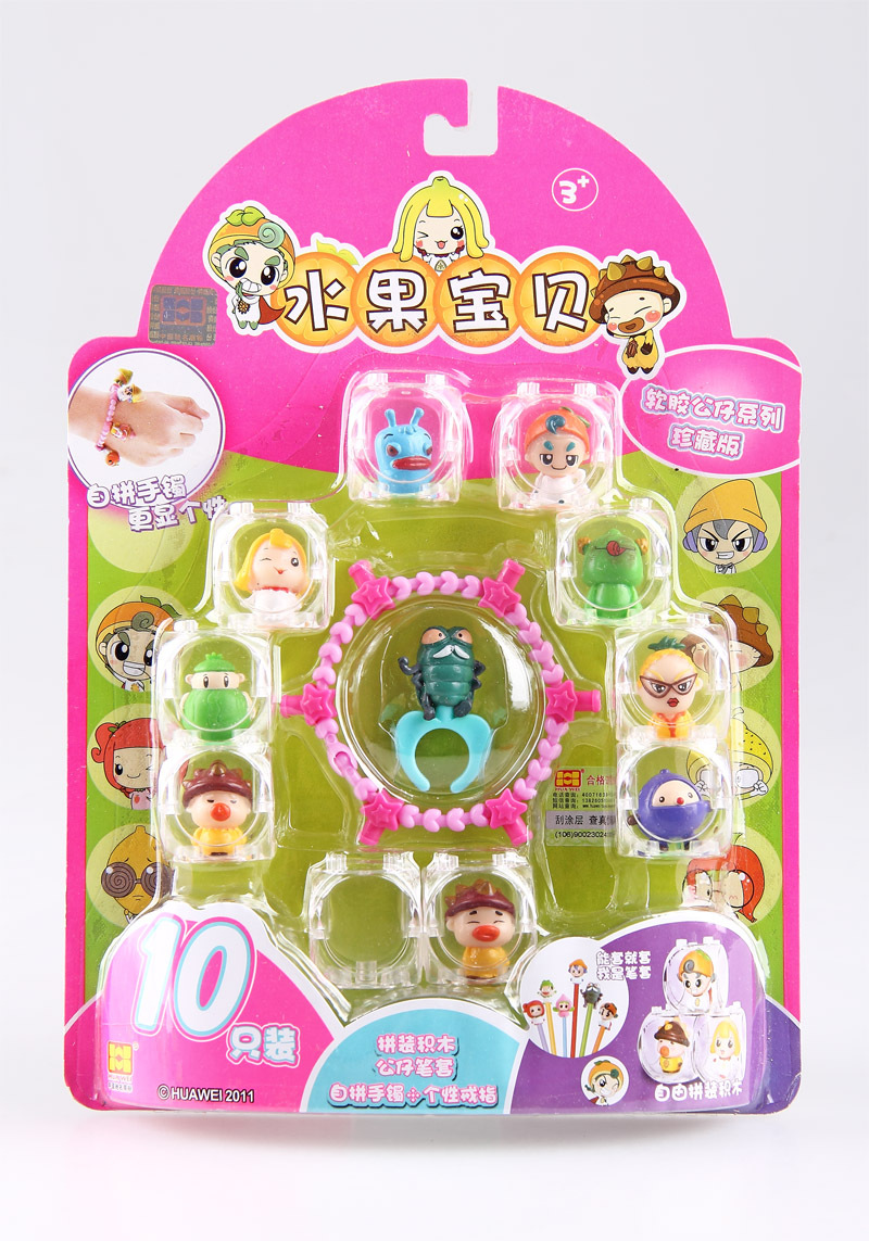 產品簡介:本產品是動畫片《水果寶貝》的衍生動漫產品,組合了《水果寶貝》中36款形象公仔系列中的10款,配合積木型收藏盒,便于收藏精致的公仔,包裝中配有手鏈一條,手鏈是由手環圈和五角連桿兩部分組成,別致可愛,顏色絢麗的迷爾公仔可裝配在五角星連桿上的圓形柱子上變成各種不同款式的公仔手鏈,功小朋友戴在手腕上。包裝中另配有一枚戒指,別致可愛、顏色多種絢麗,可以把顏色絢麗的迷爾公仔裝配在圓形柱子上變成不同款式的公仔戒指。另外《水果寶貝》形象公仔還可疊加在筆頭做裝飾,玩法多樣,趣味性強。