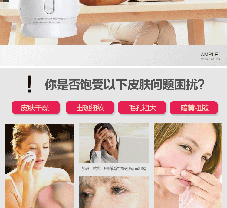 親們會擔心這個補水儀會把毛孔變粗,這個不用擔心 我們采用的是納米補水,而且是熱噴(溫度40度),不會對皮膚有什么害處,只會讓女人的皮膚變嫩,膚質變好。