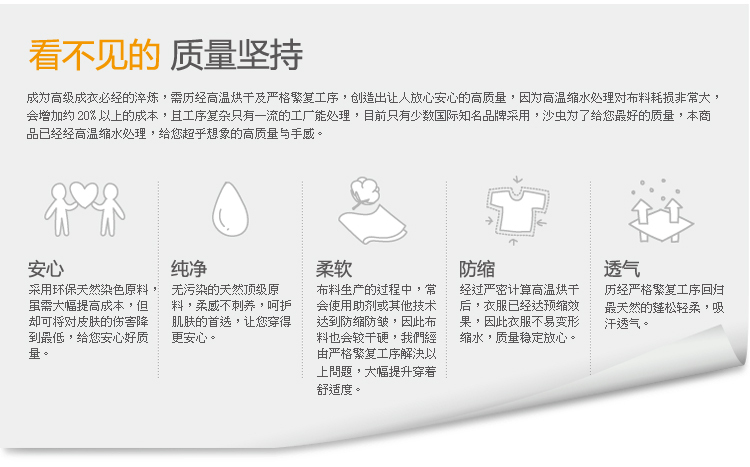 純棉織品耐熱能良好,在攝氏110℃以下時,只會引起織物上水分蒸發,不會損傷纖維,所以純棉織物在常溫下,穿著使用,洗滌印染等對織品都無影響,由此對提高了純棉織品耐洗耐穿服用性能。