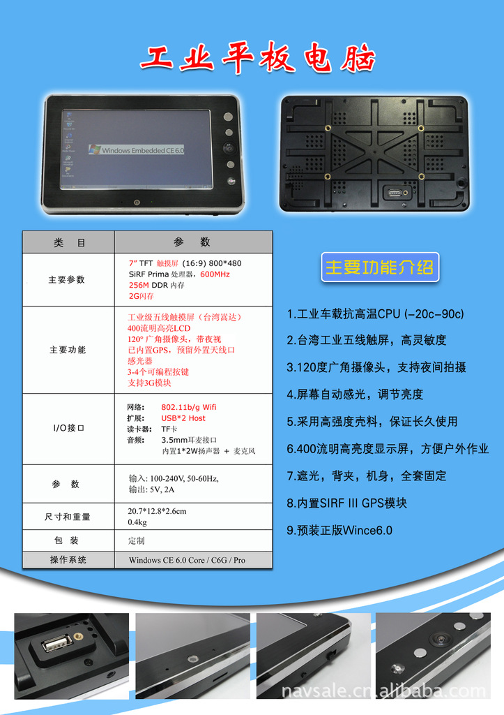 平板電腦批發,抗高底溫,七寸五線觸摸屏Windows CE操作系統機器帶有串口160度感光攝像頭背部可固定具有三防功能。