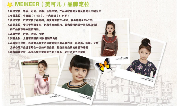 5.我們美可兒主要做的是高檔100-150cm左右中大童產品和部分小童產品,質量優秀,款式精良,我們品牌的童裝是商場和大賣場的???,請不要拿那些低價,小版型,質量差的一般阿里供應商跟我們比價格,阿里巴巴只是我們多個銷售渠道中的一個,我們不屑與這類供應商為伍,我們做的是長久生意,賺良心錢,不做一錘子買賣!