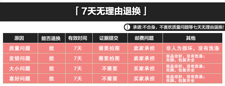 如需退貨/換貨請在簽收后聯系我們,如是質量問題7天包退貨/換貨郵費由賣家承擔,7天后如有特殊情況,產品在不影響第二次銷售可以退/換貨,郵費由買家承擔!郵費以本店發貨郵費為準!