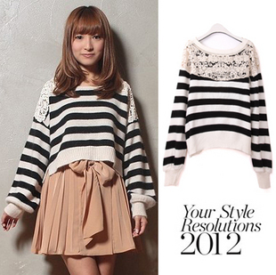 2012秋冬新款條紋水溶蕾絲鉤花拼接鏤空短款長袖針織衫 罩衫 女
