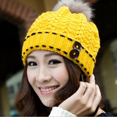 冬季女士套頭帽子 韓版加厚雙扣毛線針織帽 帶狐貍毛球