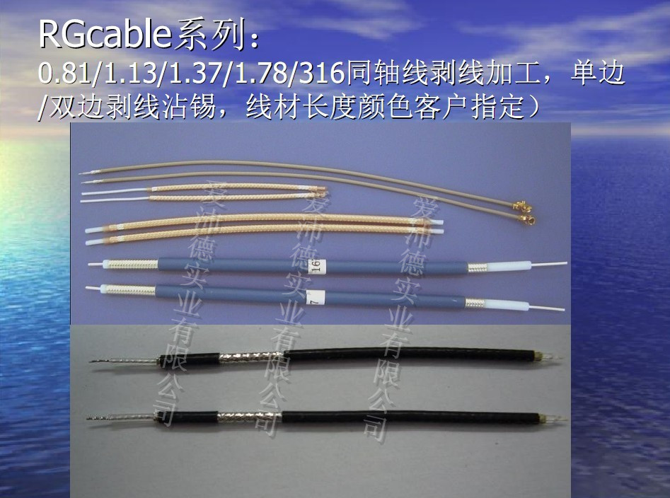 愛沛德實業有限公司專業生產I-PEX MHF全系列產品(I-PEXMHFI,MHFII,MHFIII),可配以下規格的MINI COAXIAL CABLE (0.81mm,1.13mm,1.32mm,1.37mm,1.78mm)外被顏色有:黑色,白色,灰色,紅色,藍色,棕色等.根據客戶需求可配各種射頻連接器(RF CONNECTOR:SMA SSMA MCX MMCX ,SMB,BNC,TNV,N頭等),其產品的長度可根據客戶的需求需定.產品符合ROHS標準