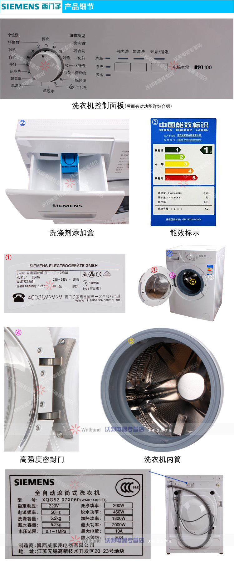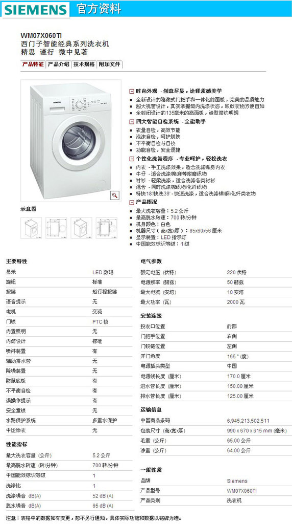 SIEMENS/西門子 WM07X060TI滾筒洗衣機 全自動節能補貼260元