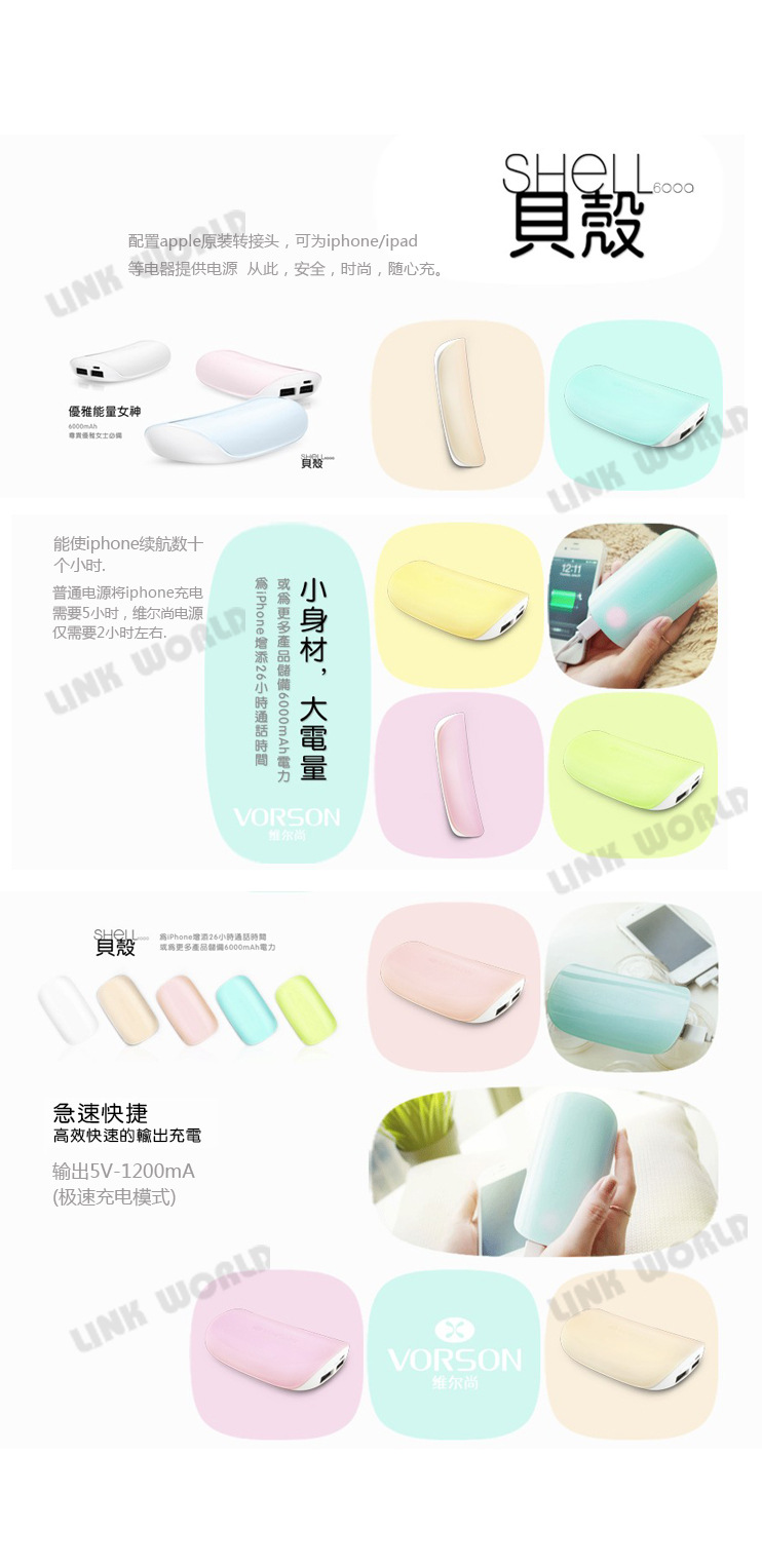 移動電源 貝殼6000mah電源 移動充電器 iphone/ipad充電器 維爾尚
