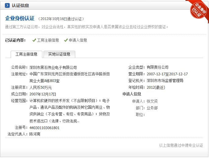 提示:您好,我方商業信用在阿里巴巴網站上有記錄了!附上誠信檔案: 深圳黑石偉業電子有限公司已通過阿里巴巴提供的第三方實名認證, 信用編碼:, 聯系人:張文賢, 聯系方式:, 真實存在。 該會員在阿里巴巴上誠信記錄良好。 提示:為降低風險,阿里巴巴建議您 通過以上聯系方式進行聯系?!景⒗锇桶汀?/p>