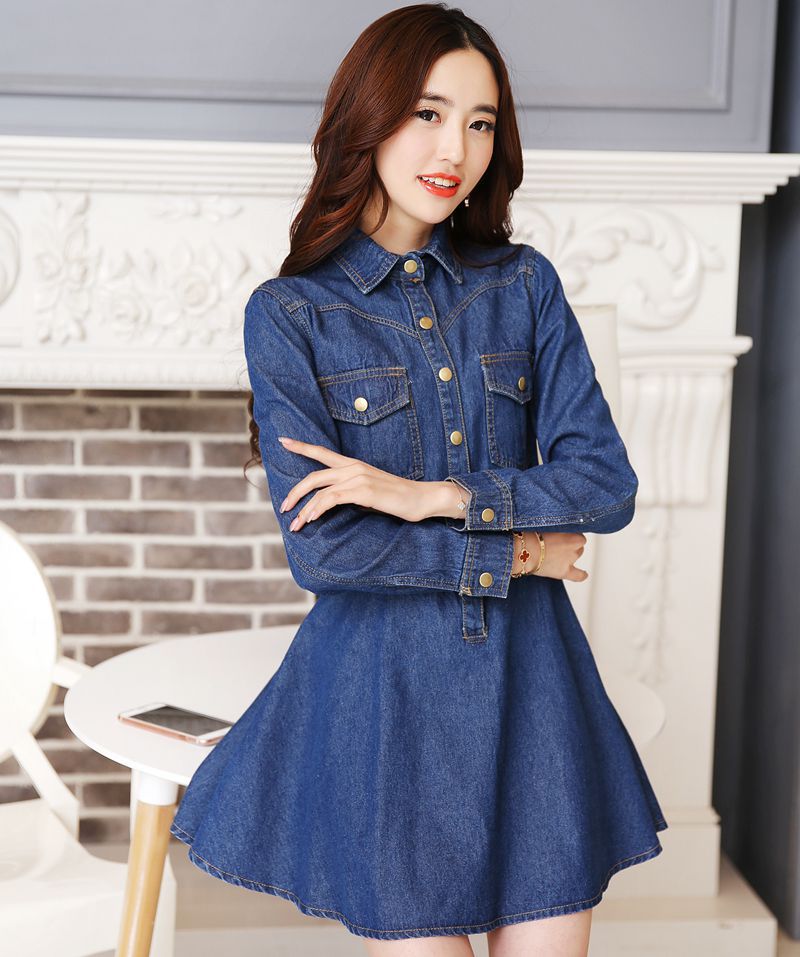 2015春季新款女裝學院風長袖復古顯瘦牛仔裙秋裝連衣裙