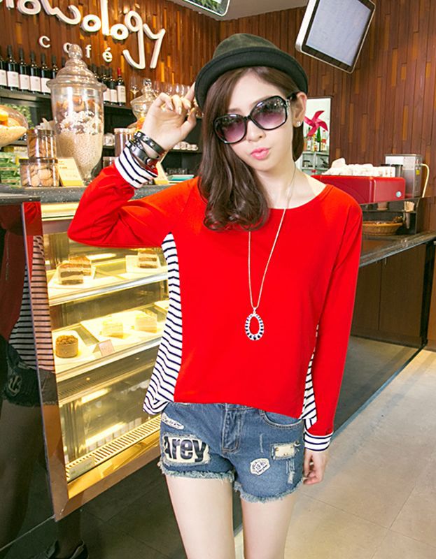 產品信息產品名稱:條紋拼接寬松上衣產品貨號:863產品顏色:嫩綠色 紅色產品面料:棉產品參數厚度指數