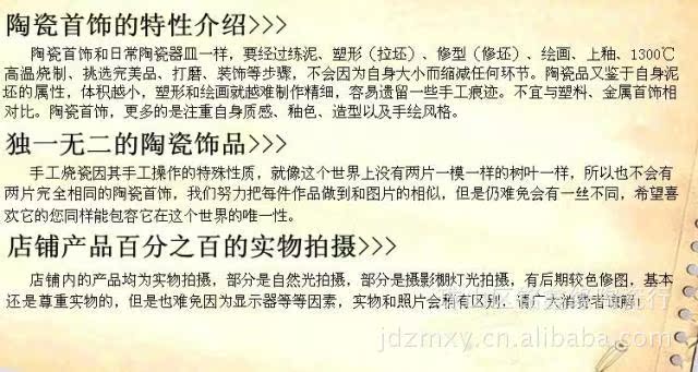 純手工創作的陶瓷首飾,每一個飾品都有著獨有的韻味,純手工意味著每個陶瓷首飾都有細微的差別,正是這差別給陶瓷首飾帶來了獨有的靈氣,的美。、