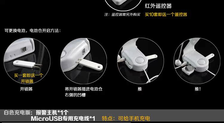 值得注意的是本品根據親們的需求,除有多種外觀可選外,有可充電和不可充電的附加功能,若親們拍了充電功能的展示架需要再拍一條充電線,就完美了;另外我們贈送的報警主機默認是遙控控制的,但遙控器因質量及成本等多種原因需親另購,不過購買10套既可以送一個紅外遙控器。本品主要是用3M膠粘在手機上,隨機贈送的3M膠是一次性的,親們更換樣機時需要更換新膠。