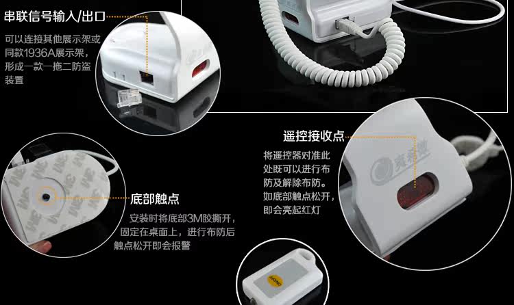 本防盜展示架顧名思意,主要用于手機真機的展示多功能防盜體驗架,當然也適用于電吹風、家電遙控器、剃須刀等小家電的防盜演示。本品由展示架 報警主機 紐扣電池幾部分組成,并自帶充電插口,可選充電功能。在使用過程中根據布防后指示燈亮光狀態,當指示燈發紅光時要記得即時充電,指示燈亮綠光表示正常工作,更多細節請咨詢我們在線客服。