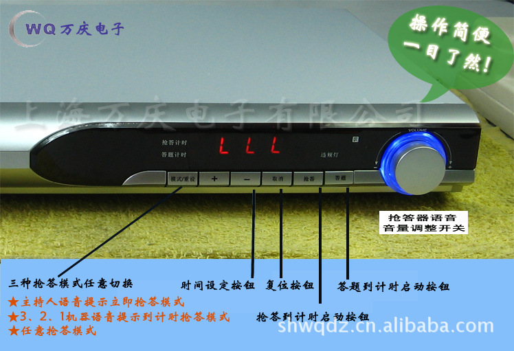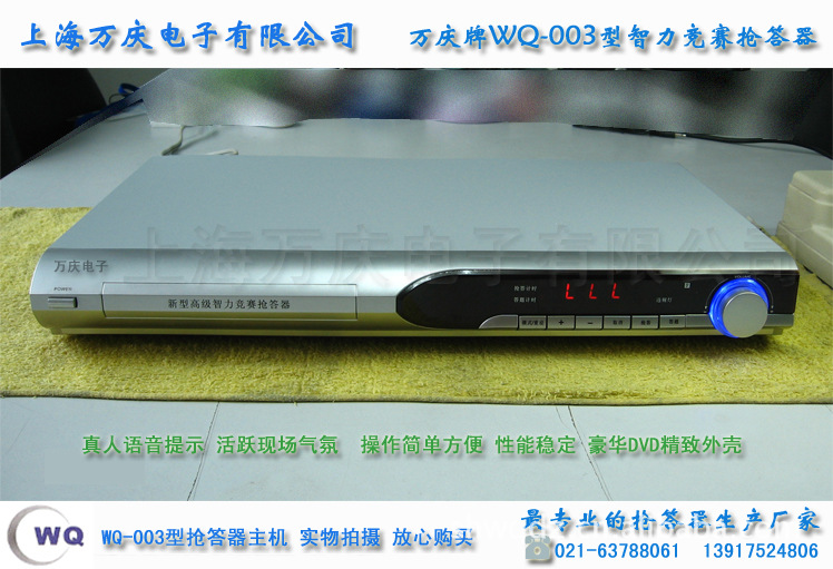 萬慶電子003B型智力競賽搶答器廣泛適用于學校,教育部門,企事業工會組織,黨團委,俱樂部等舉辦各種知識,技術競賽和文娛活動,是本公司推出的產品.該產品性能穩定,技術先進,質量可靠.具有以下特點: