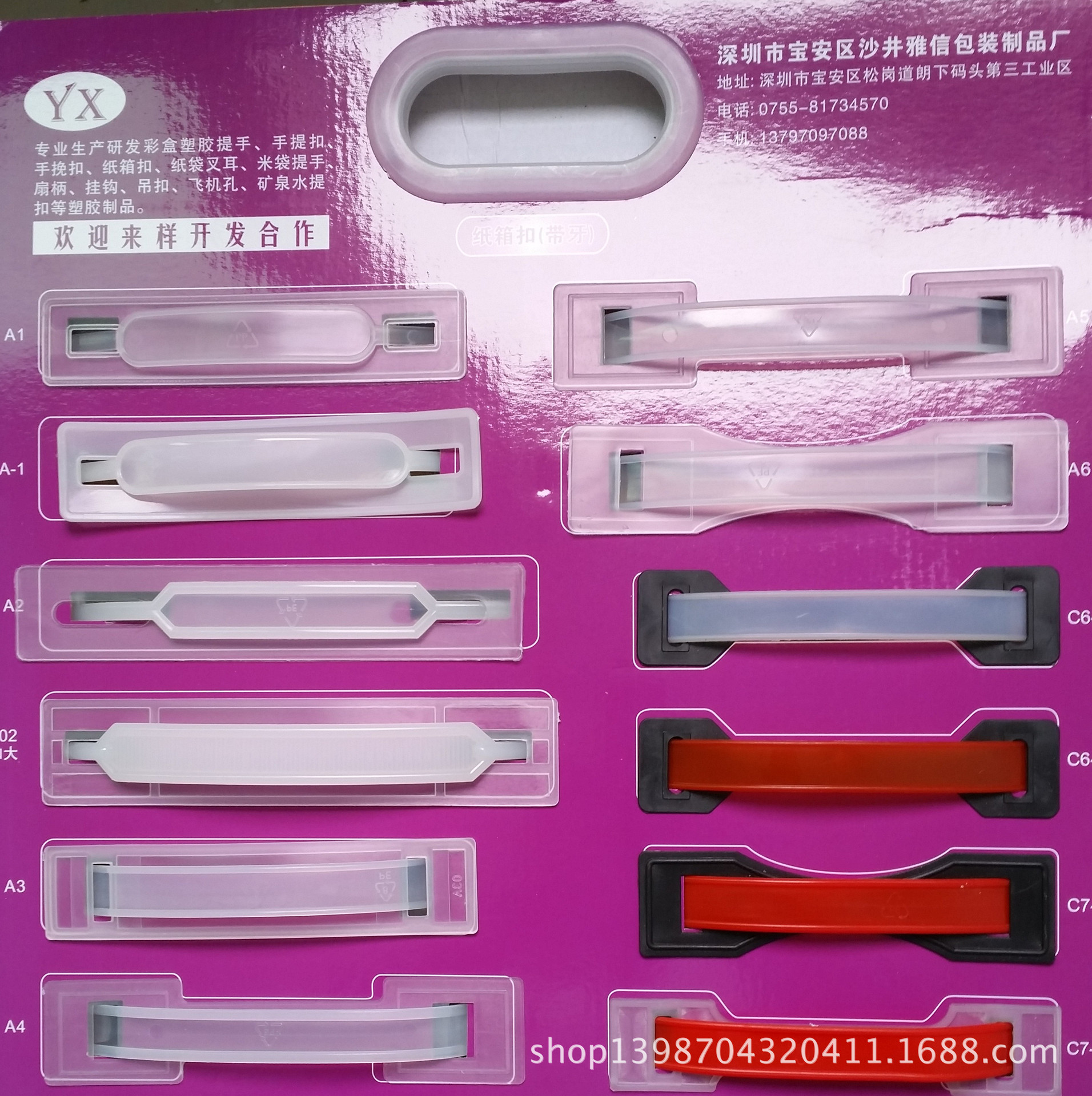 我公司專業生產銷售各種彩盒、彩箱、手提袋/米袋/面粉袋配套專用塑料提手,塑膠提手扣、手提扣、手挽扣、手提把、手挽帶、紙箱扣環/扣手、拎手,各式塑膠吊扣、掛鉤、紙袋手挽,米袋扣手,面粉袋扣手等產品多達八十多款;“質量好,交貨快,價格平”同時承接樣板開發設計,加工等業務;歡迎來電咨詢。