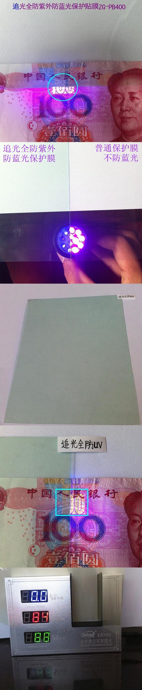 一、產品簡介:追光全防紫外線屏幕保護膜ZG-PB400是采用聚酯薄膜(PET)為基材,通過多層交叉涂布方式生產制造出來的100%防紫外線膜。本產品是一種可全防紫外線抗疲勞及防惡性黑色素細胞癌的光學膜,屬型防護產品。追光全防紫外線膜能達到100%抗紫外線的功效,能防止室外光線中UV-τmax的輻射,能有效過濾380-400nm有害射線的可見光高能區短波藍光,可以有效防止紫外線對人體的輻射損傷,能夠保護人眼與皮膚,預防白內障、皮膚癌等疾病,同時大大降低紫外線照射而導致的室內裝飾、物品的老化褪色程度,具有健康防護、永不曬黑、減少眩光、保質期10年等特性。世衛組織WHO愛眼協會發出橙色預警:“藍光輻射對人類的潛在隱性威脅將遠遠超過蘇丹紅、三聚氰胺、SASI、HINI的破壞性,無形中吞噬人的雙眼”。二、技術參數:型號:ZG-PB400材質:PET顏色:淡藍色可見光透過率:88%紫外線阻隔率:100%使用層厚度:180微米三、產品結構:離型膜 安裝膠涂層 PET基膜 防紫外線復合層 PET基膜 耐劃傷層四、產品特性:1、具有全防紫外線功能,能夠阻隔100%紫外線;防藍光抗疲勞防近視;2、透明性能好,可見光透過率大于88%;3、膜表面進行過防劃傷硬化處理,耐擦洗,耐酸堿;4、使用壽命長,耐老化,保質期長達10年。五、應用領域:MP3、PAD、學習機、游戲機、手機、電話、電腦、電視、儀器等電子產品的顯示屏。六、包裝規格:1.52m*30m/卷